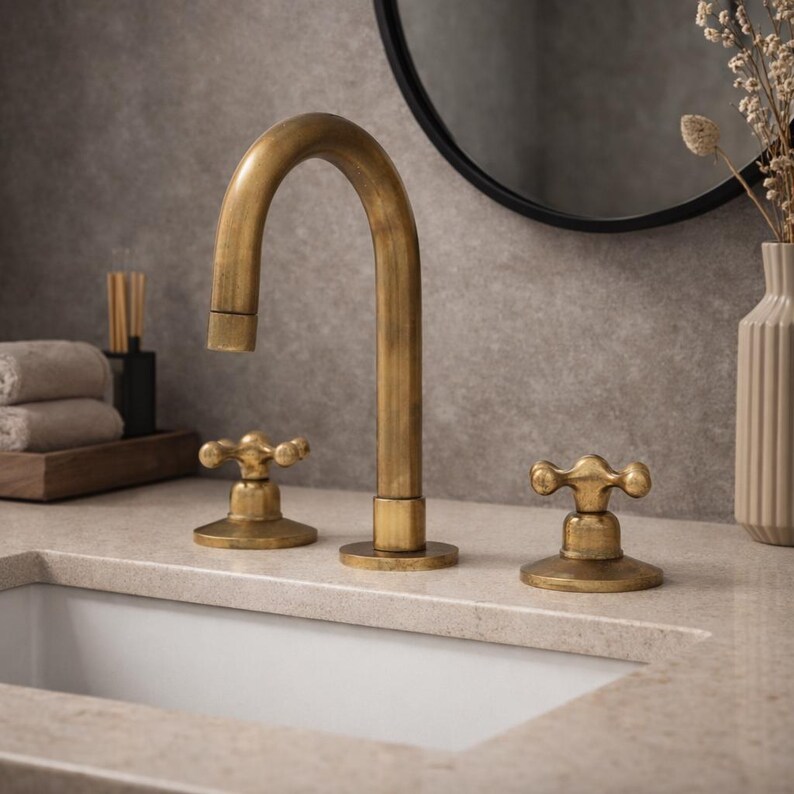 Antiek Messing Widespread Badkamerkraan – 3-Gats Set met Kruishendels