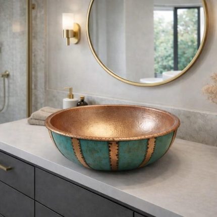 Gehamerde Koperen Ronde Opbouw Wasbak – Antiek Gouden Afwerking