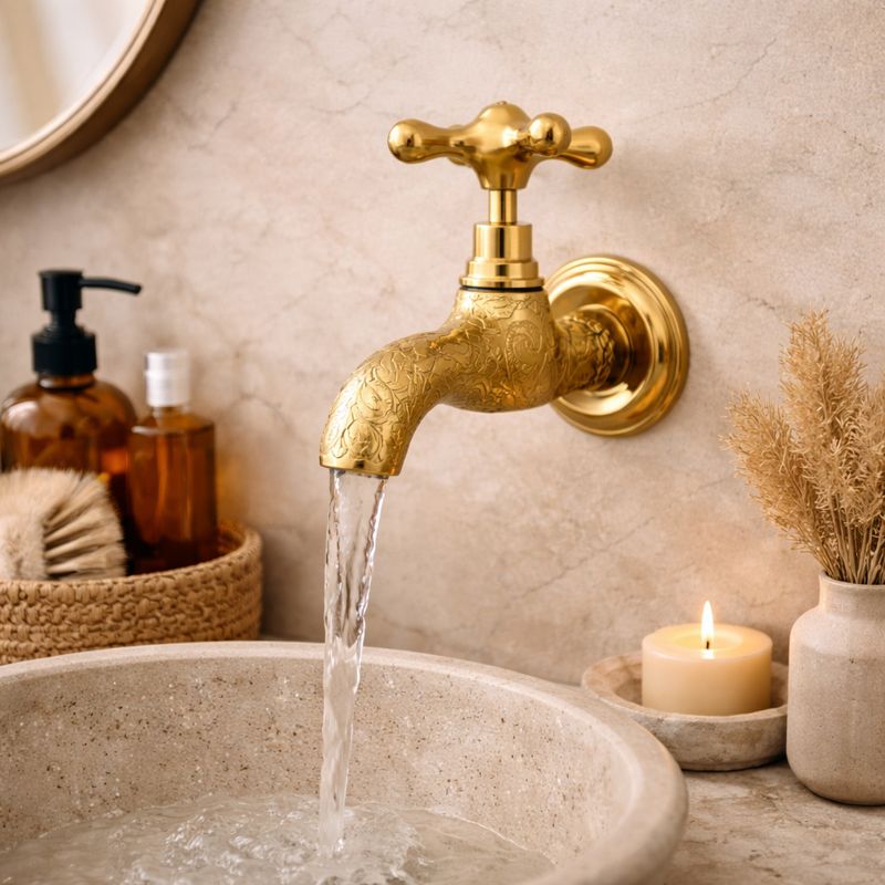 Geef je badkamer een luxueuze uitstraling met deze gegraveerde messing wandkraan. Met verfijnde bloem-/arabeskgravures op de uitloop en een klassieke kruishendel brengt deze kraan een elegante vintage sfeer in elke ruimte. De gepolijste goudkleur reflecteert het licht prachtig en combineert perfect met steen, marmer of handgemaakte waskommen.