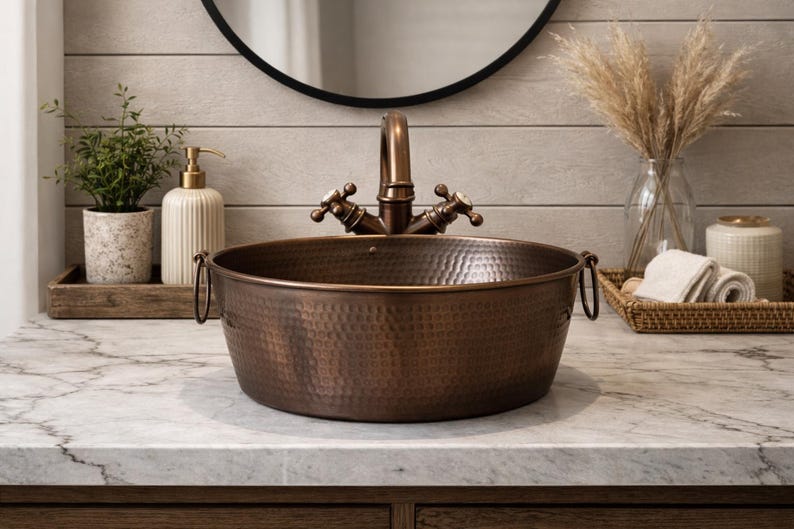 Breng een krachtig rustiek statement in je badkamer met deze gehamerde koperen trog-opbouw wasbak. Ontworpen in een brede ovale vorm met zijring-handgrepen combineert deze ambachtelijke waskom vintage charme met moderne functionaliteit. De gehamerde textuur voegt diepte en karakter toe, waardoor hij een perfect middelpunt is voor landelijke, rustieke, industriële of boho interieurs.