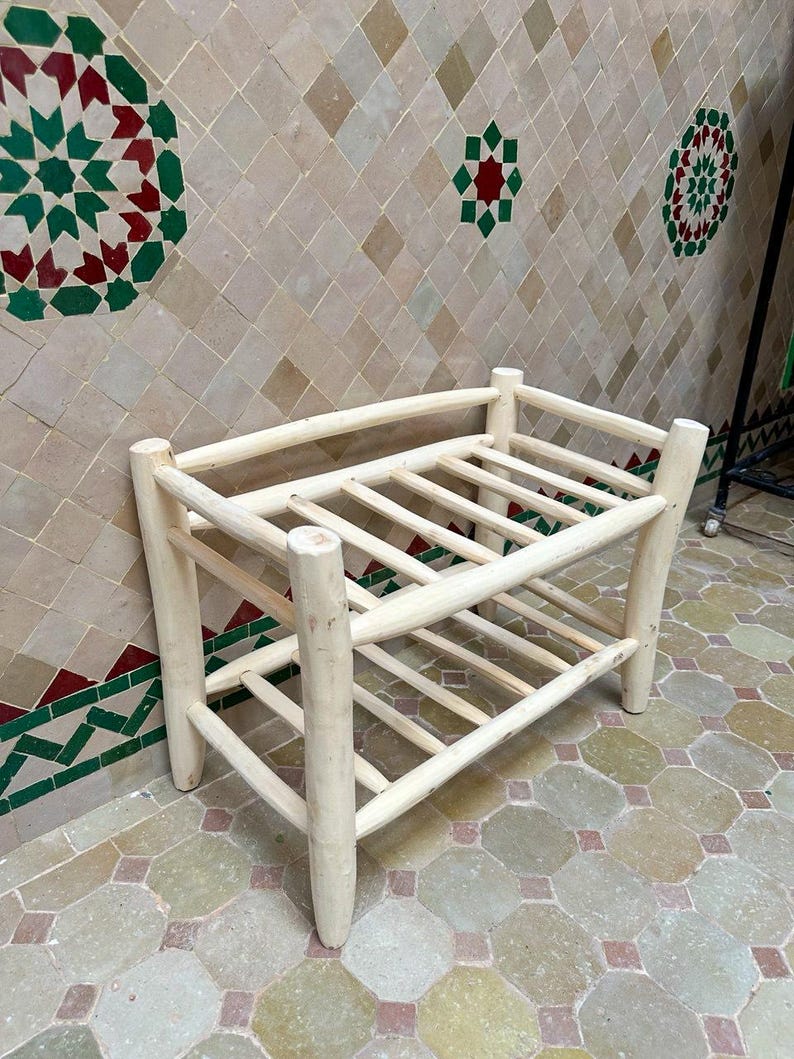 Breng warmte, charme en functionaliteit in je hal met dit handgemaakte houten schoenenrek, vervaardigd uit natuurlijk hout door ervaren ambachtslieden in Marokko. De organische lijnen en stevige constructie maken het zowel een praktische opberger als een decoratief accent.