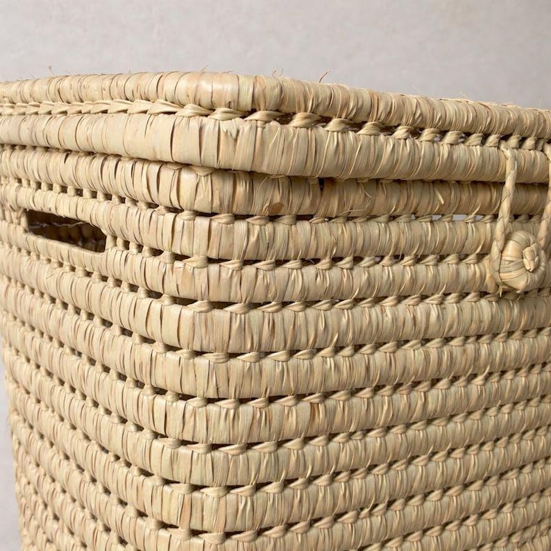 Zowel decoratief als functioneel is deze handgeweven opbergmand een must-have voor elk huis. Ideaal als wasmand en om dagelijkse spullen netjes uit het zicht te houden. Gemaakt van palmblad met stevige zijhandgrepen en een bijpassend deksel voor een opgeruimde uitstraling.