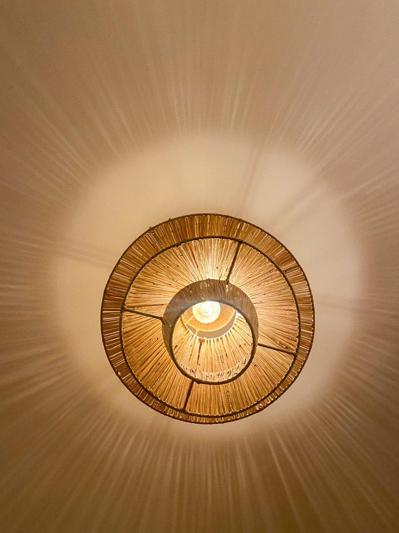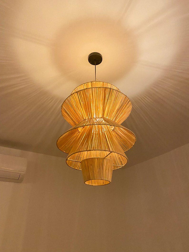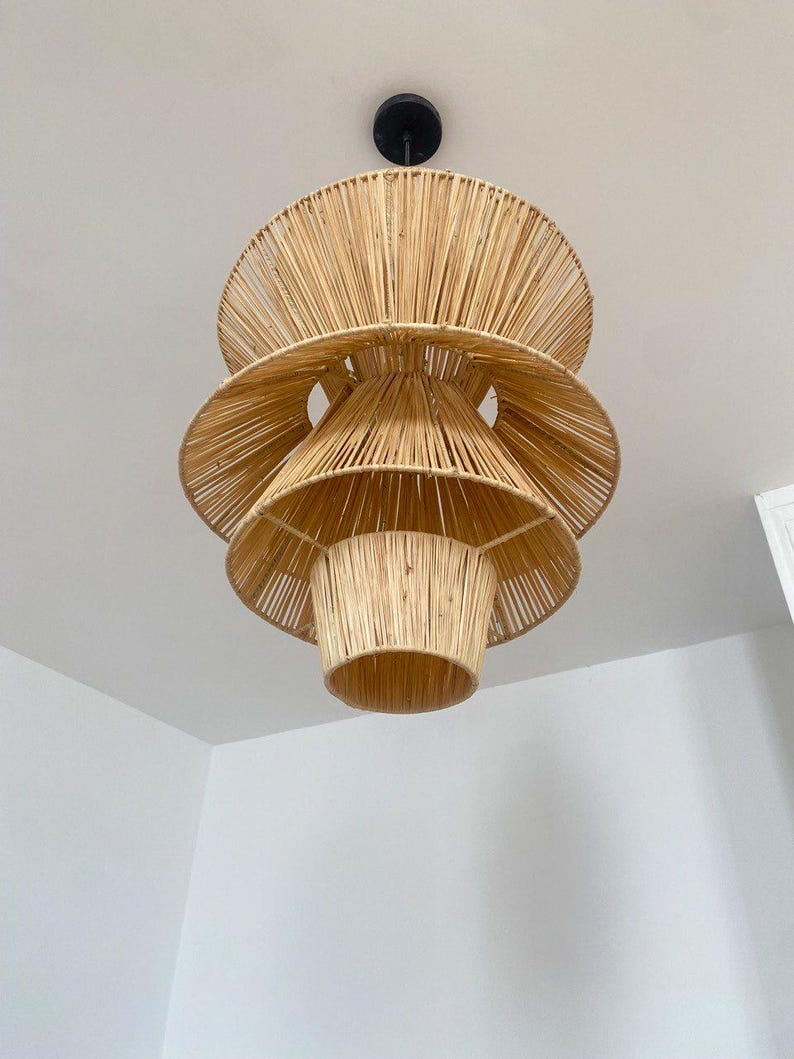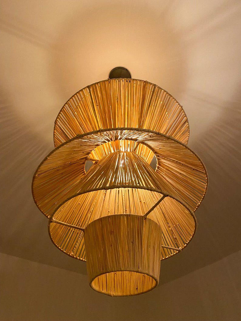 Deze meerlagige raffia hanglamp combineert Marokkaans vakmanschap met een krachtig architectonisch ontwerp.