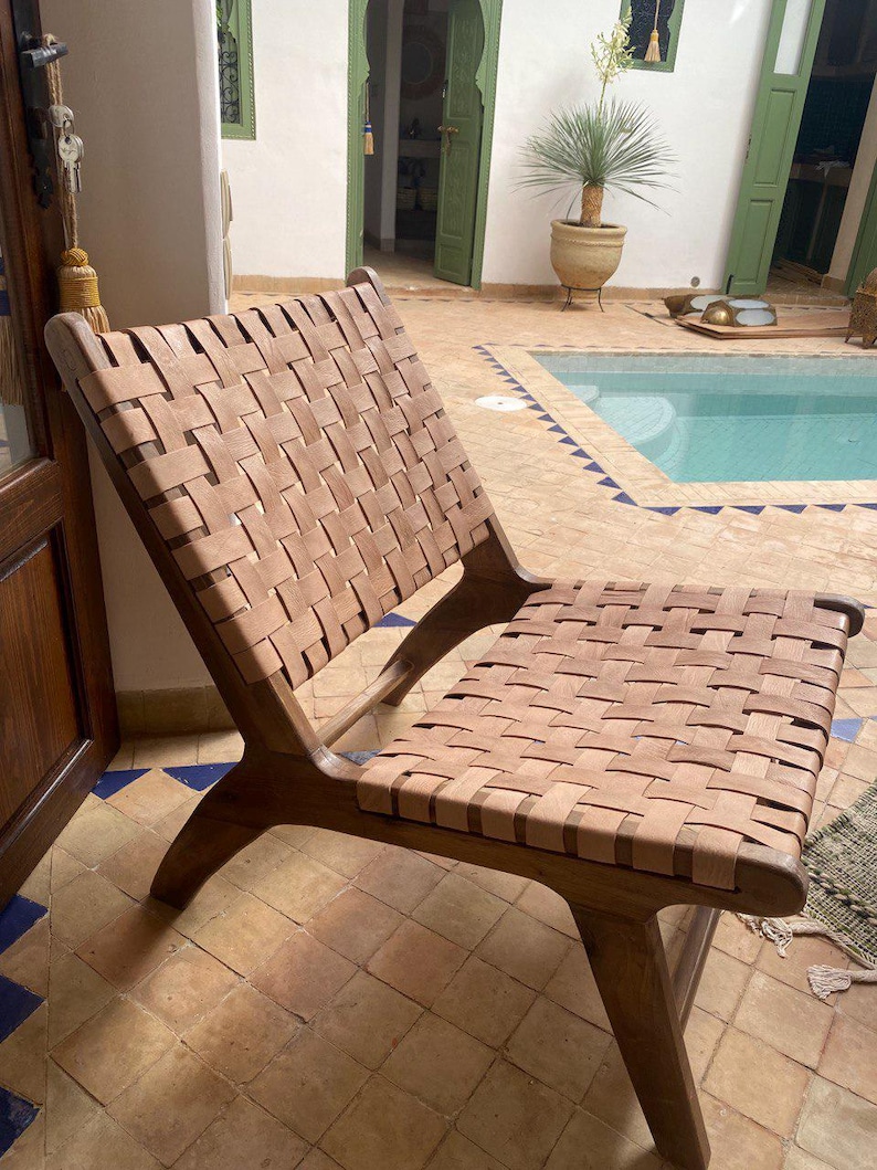 Ervaar de perfecte mix van traditie en modern comfort met deze handgemaakte Marokkaanse fauteuil. Gemaakt van warm walnoothout en premium naturel leer, weerspiegelt dit meubel de diepte van Marokkaans vakmanschap met een verfijnde, eigentijdse uitstraling.