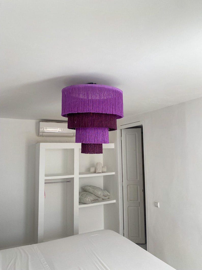 De gelaagde franje voegt zachtheid en diepte toe en verspreidt het licht subtiel door de ruimte.