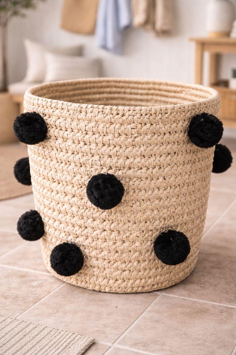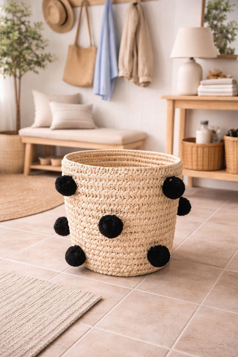 Voeg een subtiel boho-accent toe aan je interieur met deze handgeweven ronde wasmand, afgewerkt met zachte zwarte pompons voor een elegant contrast.