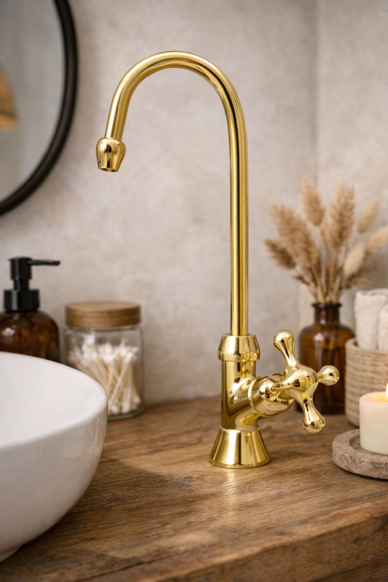 Voeg tijdloze elegantie toe aan je badkamer met deze vintage-geïnspireerde gepolijste messing kraan. Ontworpen met een hoge zwanenhalsuitloop en een klassieke kruishendel brengt hij een verfijnde, klassieke uitstraling terwijl hij toch strak en modern blijft aanvoelen. De glanzende goudkleurige afwerking reflecteert het licht prachtig en maakt hem tot een perfecte blikvanger voor marmeren, stenen of houten werkbladen.