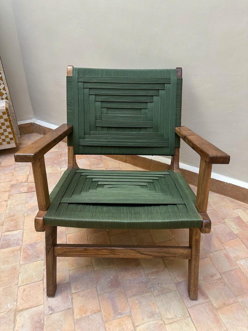 Breng een vleugje Marokkaanse authenticiteit in huis met deze prachtig handgemaakte fauteuil, vervaardigd uit massief walnoothout en geweven met natuurlijk groen koord. Ontworpen met zowel uitstraling als comfort in gedachten, combineert dit meubel traditioneel vakmanschap met een moderne, minimalistische look.
