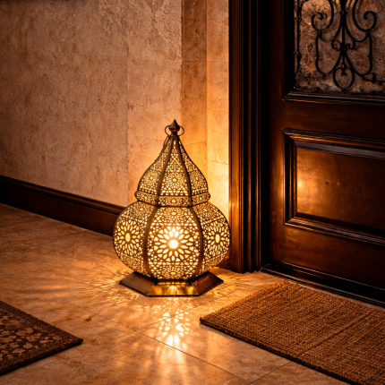Marokkaanse Messing Vloerlantaarn – Handgeperforeerde Voet voor Entree en Woonruimte