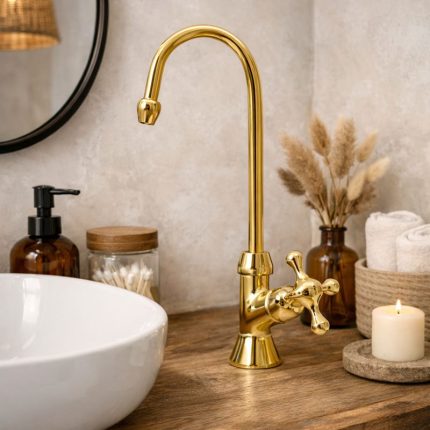 Vintage Gepolijste Messing Badkamerkraan – Kruishendel Zwanenhalskraan