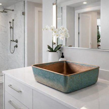 Vierkante Koperen Opbouw Wasbak met Turquoise Patina – Gehamerde Badkamerkom