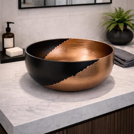 Tweekleurige Koperen Opbouw Wasbak – Gehamerde Ronde Kom met Zwarte Binnenkant
